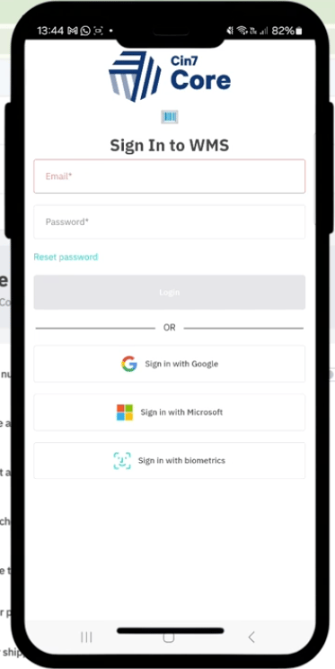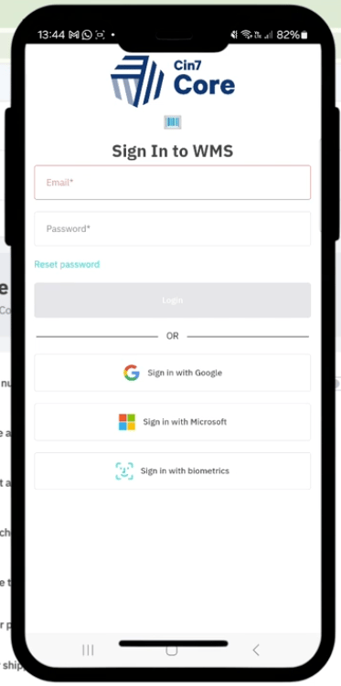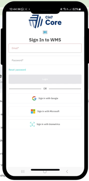 Log in with your Cin7 Core credentials (biometric login also available)