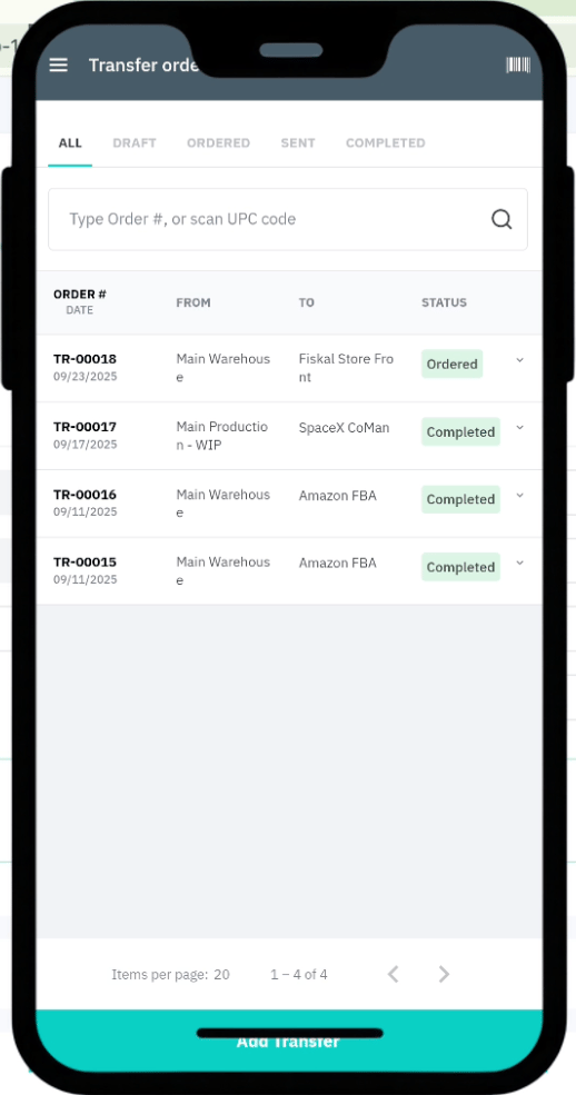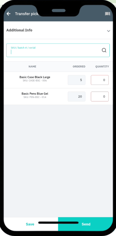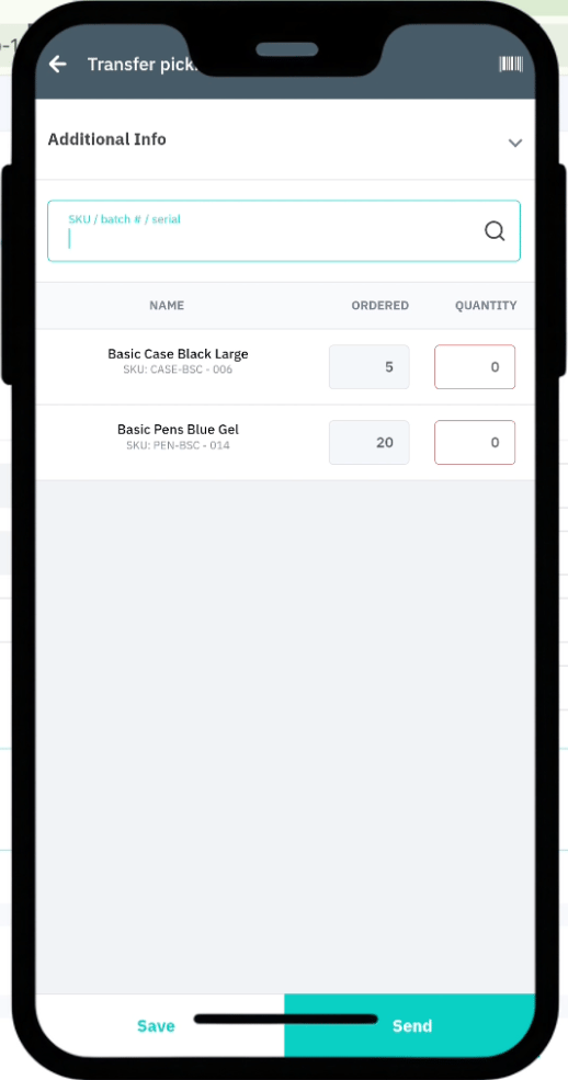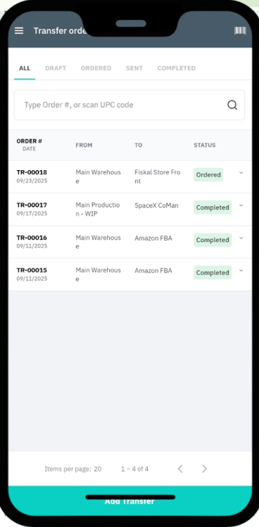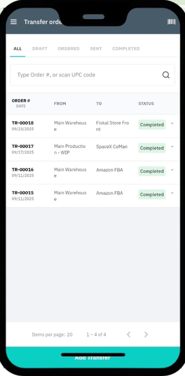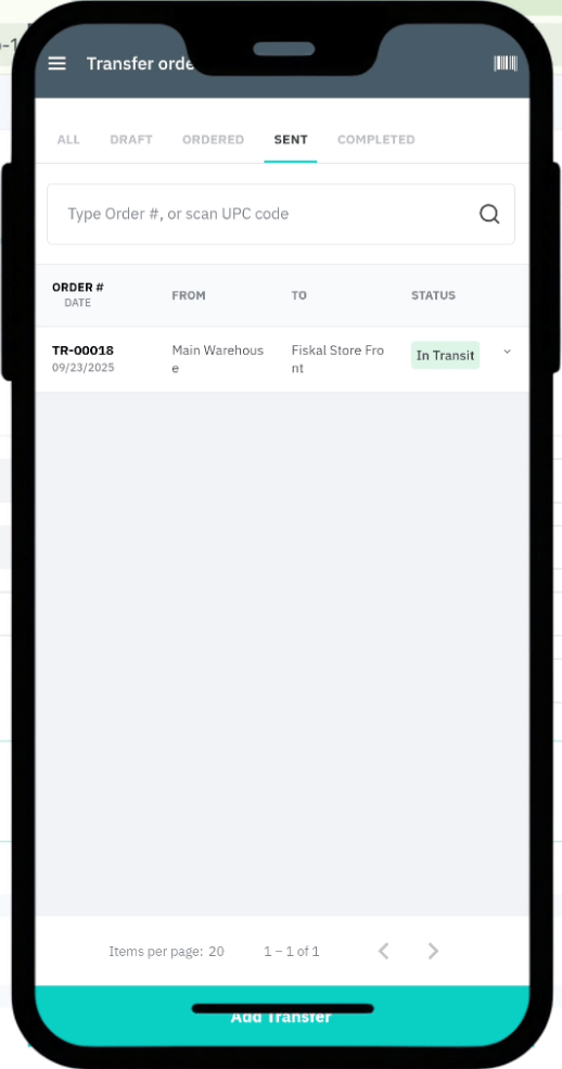 Save; it will appear as a Pending Transfer in the WMS app